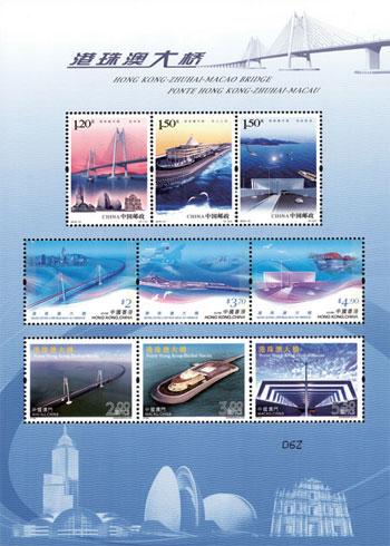 中国邮政定于10月30日发行《港珠澳大桥》纪念邮票一套3枚,邮票图案名称分别为:青州桥、东人工岛和海底隧道。同时,中国邮政与香港邮政、澳门邮电共同印制同题材邮票小全张1枚,内含中国邮政、香港邮政、澳门邮电邮票各3枚。