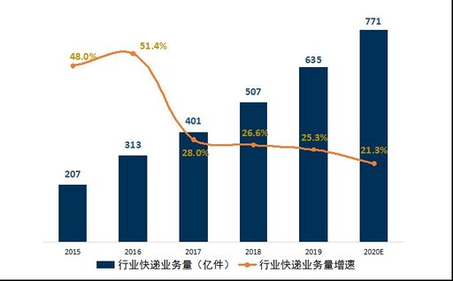 保持高位增长。2019年1月至11月,全国实物商品网上零售额为8.5万亿元,同比增长19.5%,增速进一步放缓。结合申万宏源证券预测结果,2020年,国内电商快递业务量增速将在25%左右。(见图4)
