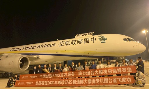 6月2日23:20,一架载有24吨优质烟台大樱桃的中国邮政航空公司B757货运专机从蓬莱国际机场起飞,80分钟后抵达南京,全国各地的买家可在24小时内品尝到新鲜美味的烟台大樱桃。这拉开了2020年邮政极速鲜大樱桃寄递首飞直航的序幕。