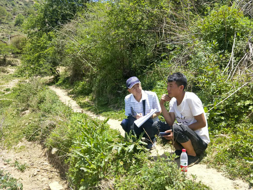 高旭闯在田边调查询问农户外出务工、子女就读、种植养殖等情况。