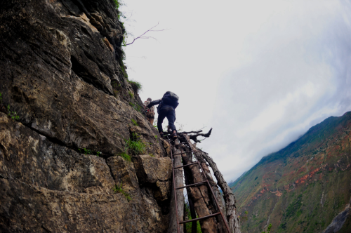 自小在悬崖村长大的某色尔者对变幻莫测的天气和枯燥的路程已经习以为常。沿路累了,他会靠着栏杆稍作休息,对着高山唱起民歌,歌声在山间回荡,洗涤着一身的疲惫。