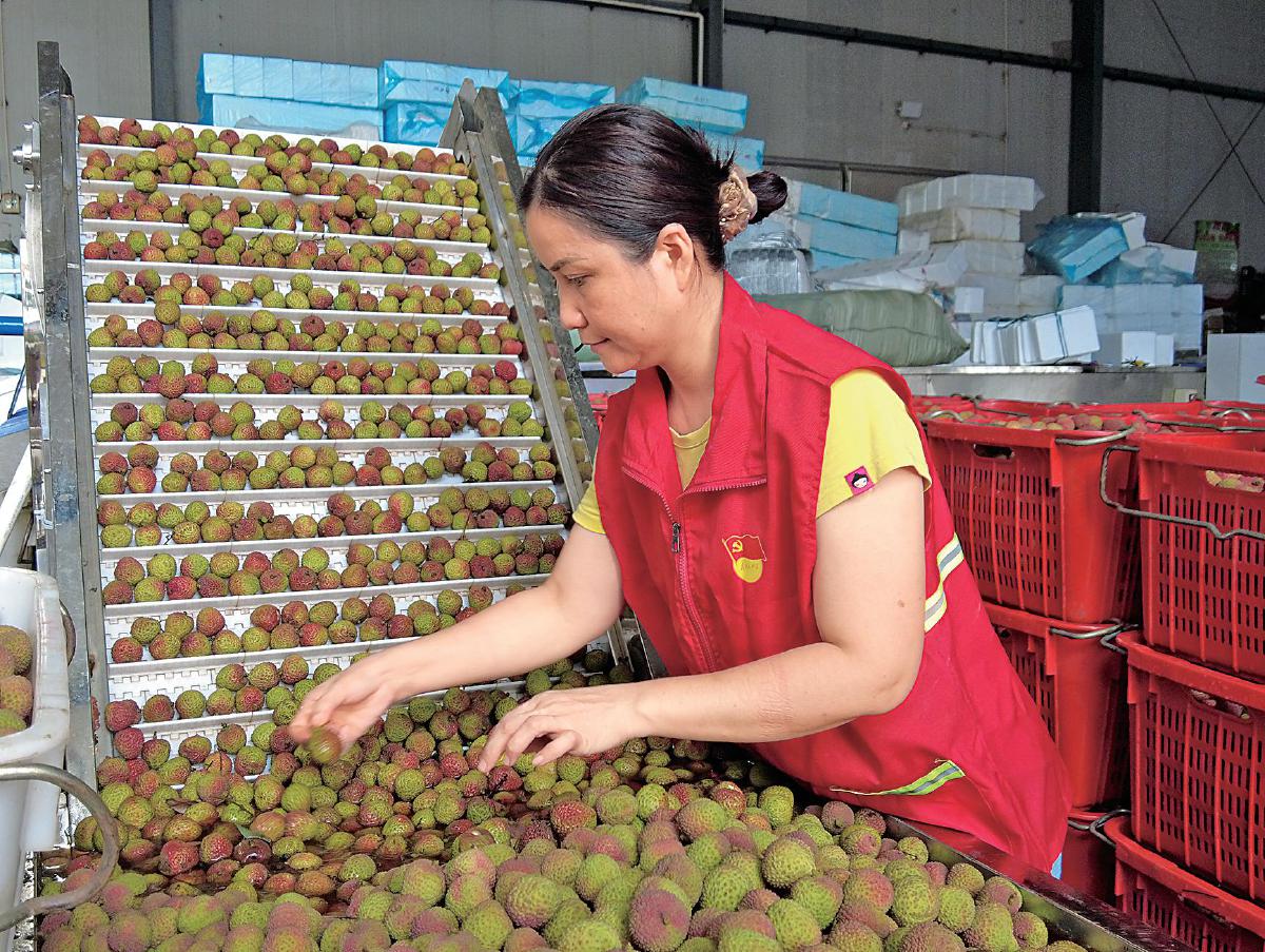 海口邮政派驻工作人员对荔枝进行质量把关。