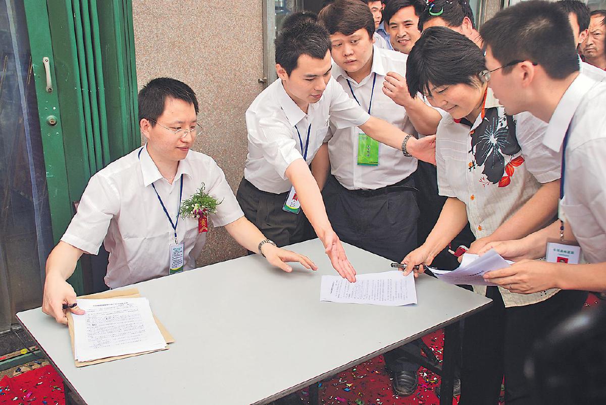 2007年6月22日,邮储银行第一位小额贷款客户董景莲(右二)办理借款手续。