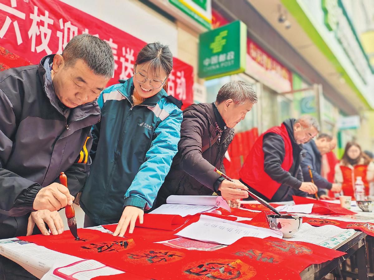 春节前夕,贵州省六盘水市六枝特区邮政分公司携手特区总工会和特区书法家协会举办“笔走龙蛇祈平安,翰墨飘香迎新春”活动,免费为群众写“福”字、送春联。 □袁珏 摄