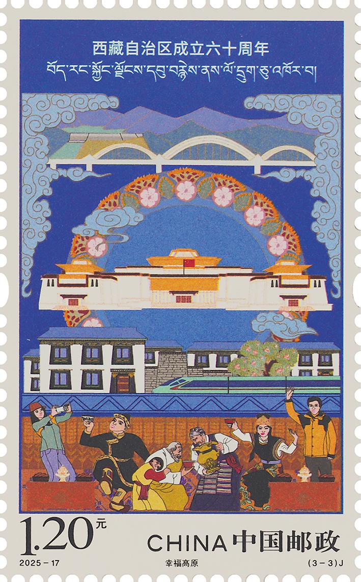 《西藏自治区成立六十周年》纪念邮票今日发行。该邮票1套3枚,邮票图案名称为:同心筑梦、美丽雪域、幸福高原。